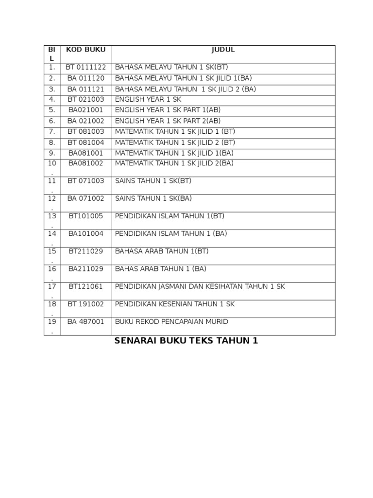 Senarai Buku Teks Tahun 1 Nama Murid Nur